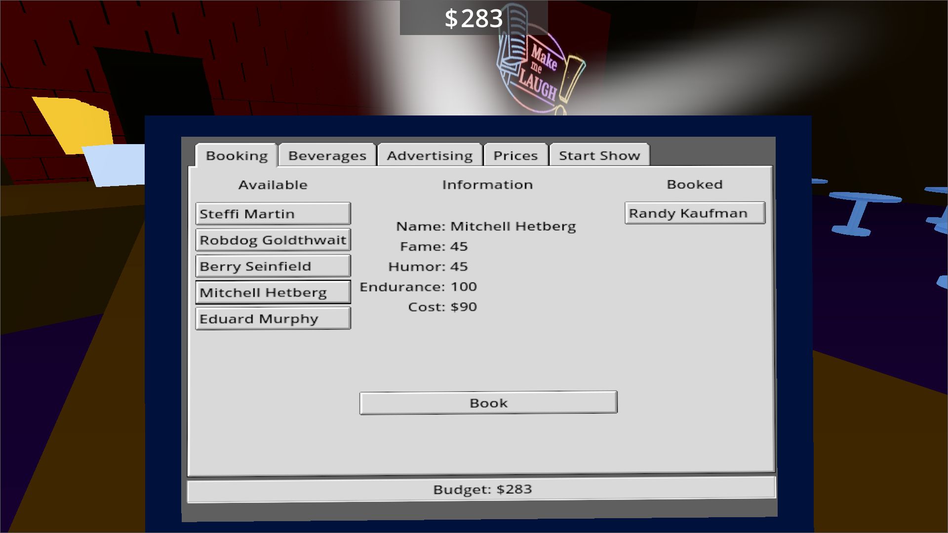 The theme of the Global Game Jam 2024 was Make Me Laugh. By chance Jan, Markus and I got talking about the theme, discussing humour in games and games that made us laugh. We realized making a genuine funny game is more often than not a swing and a miss. We settled on making a comedy club management game. It fits the theme perfectly without the do-or-die necessity to make the player laugh.