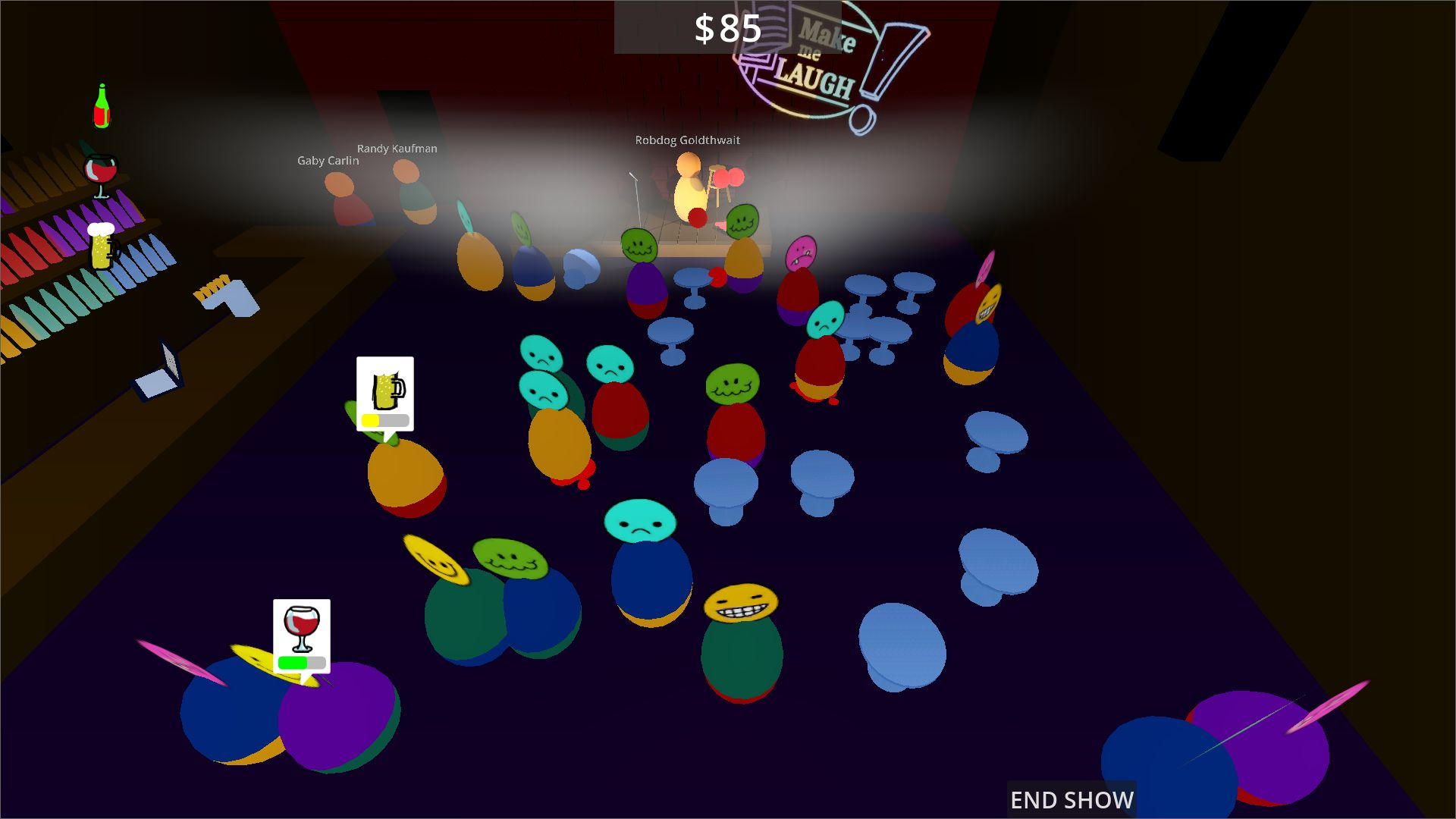 The gameplay loop consists of three phases. In the planning phase the manager hires comedians, purchases beverages and sets prices. The second phase makes up the live show. Provide drinks to the audience and manage the lineup. Replace a comedian with the next if they are bombing. The third phase is kind of an evaluation of your evening with your diabolical investor.