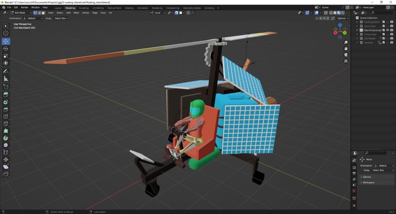 I like making 3D games more than 2D. I spent the entire first night creating the main character since the player will see it in the middle of the screen for most of the gameplay. Later, I added this solar-powered chopper which the player unlocks at the end of the game.