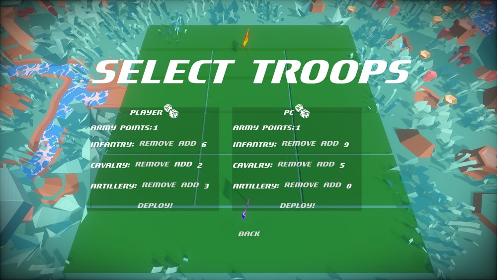 Wanted to create a more elaborate version of Fleet Battles. At the beginning of the skirmish the player can select units or let the computer determine the army composition randomly.