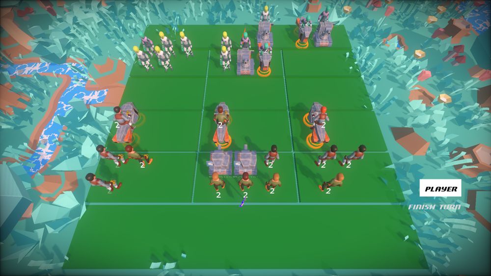 The AI evaluates the current board by attributing values to fields and units based on their position and type. It then collects all possible moves and attacks, simulates each action on the board, and evaluates the new board again. The actions are sorted by the achieved tactical gain. Depending on the difficulty level an action is then chosen from the top, middle or bottom of the sorted list of actions.